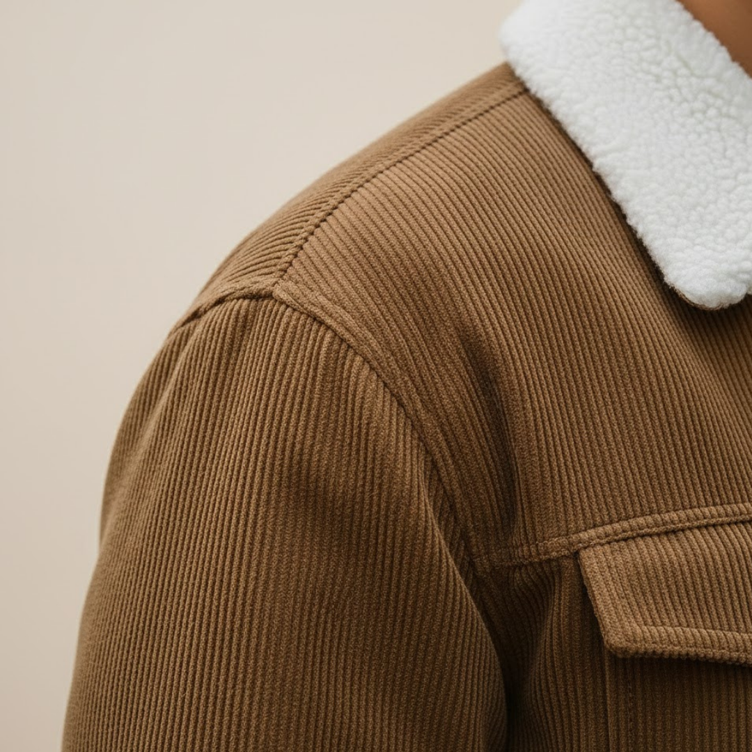 Men’s corduroy jacket for adult wear, made with a cotton corduroy exterior and fleece lining with polyester components, featuring a tailored fit, turn down collar, metal button front closure, and side pockets, suitable for layering in cooler weather.